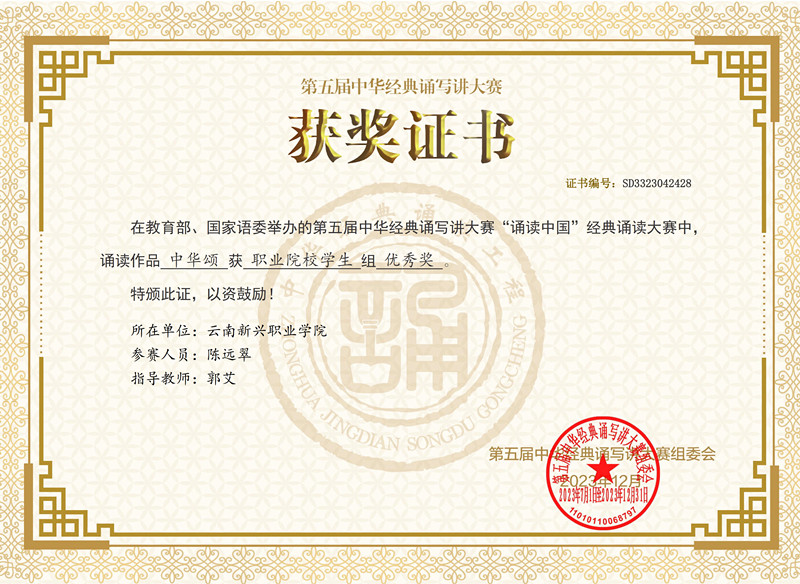 近日接到通知获悉Beat3652022级高职音乐表演班陈远翠同学参加云南省第五届中华经典诵写讲大赛,作品《中华颂》荣获一等奖,被推荐参加第五届中华经典诵写讲大赛荣获国家级优秀奖。希望Beat365广大师生广泛开展经典诵读、讲解、书...