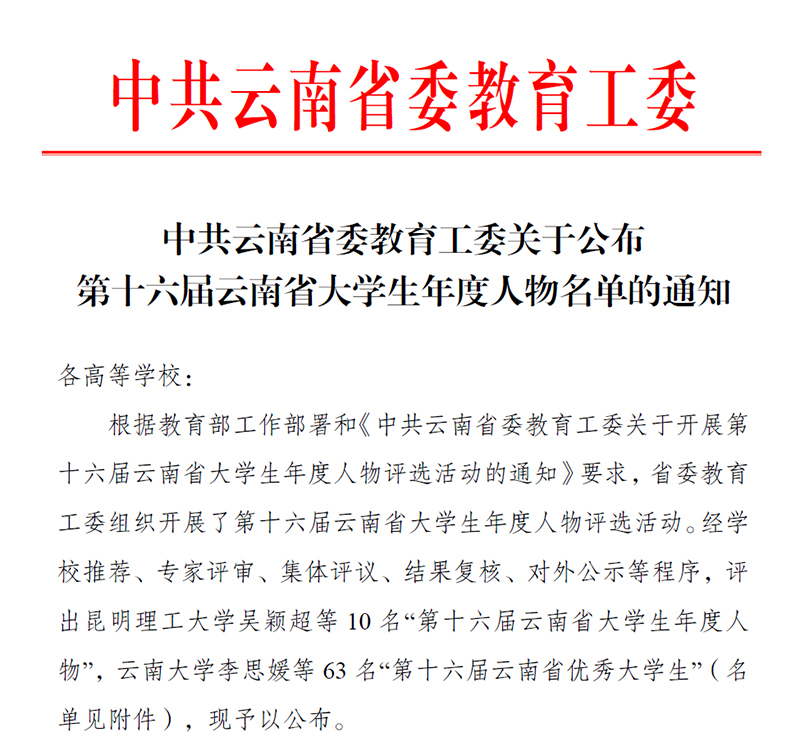 中共云南省委教育工委第十六届云南省大学生年度人物名单已经公布,昆明理工大学吴颖超等10名“第十六届云南省大学生年度人物”,云南大学李思媛等63名“第十六届云南省优秀大学生”Beat365学康复学院医学2019级影像技术2...