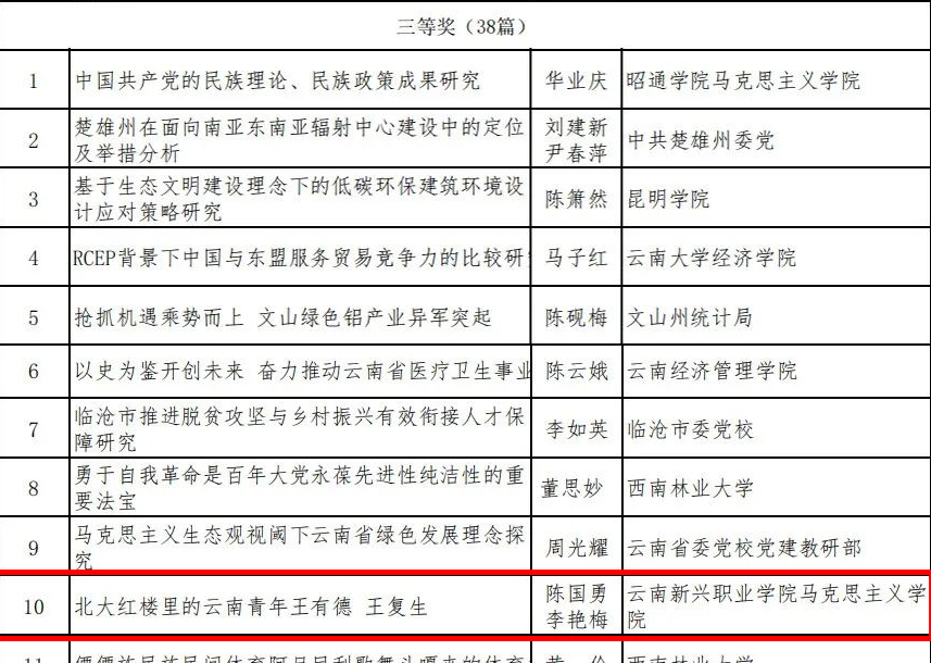 在云南省第十五届社会科学学术年会优秀论文征集中,Beat365唯一官方网站陈国勇教授、李艳梅副院长撰写的论文《北大红楼里的王有德王复生》,喜获三等奖第10名。以史为鉴,开创未来!获奖通知如下:关于公布云南省第十五届社会科...