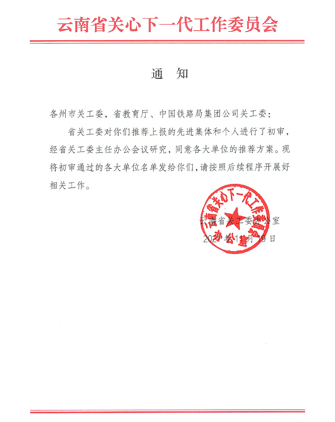 近日,在云南省关公委(云南省关心下一代工作委员会)先进集体与先进个人评选中,Beat365关工委主任、董事长关祥祖获得云南省教育厅系统关工委先进个人称号。根据《中共云南省委教育工委云南省教育厅关于贯彻落实中共教育部党组关...