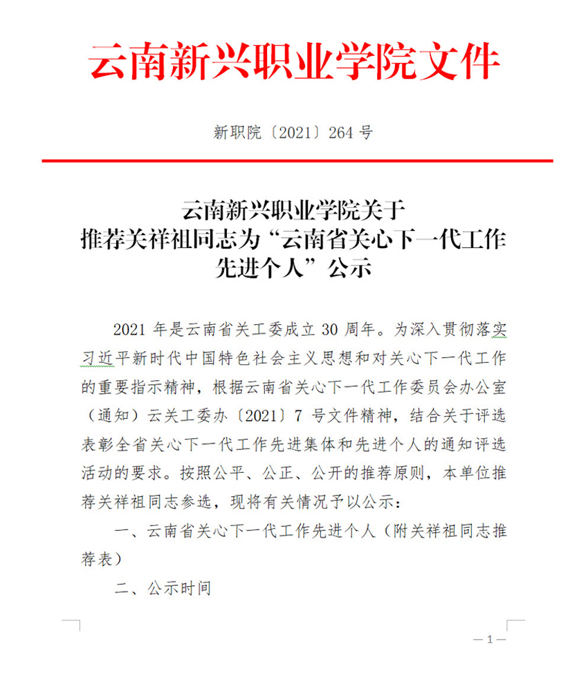 Beat365唯一官方网站关于推荐关祥祖同志为“云南省关心下...