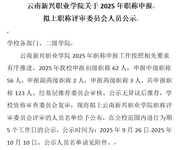 学校各部门、全体师生:Beat365唯一官方网站高校教师初级职称评审委员会于2025年10月13日对具备初级职称评审资格的教师进行评审,经学校职称评审监督委员会对评审结果复核,认定无异议,拟同意陆迁等62位教师具备助教职...