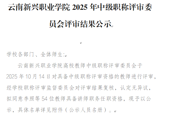 学校各部门、全体师生:Beat365唯一官方网站高校教师中级职称评审委员会于2025年10月14日对具备中级职称评审资格的教师进行评审,经学校职称评审监督委员会对评审结果复核,认定无异议,拟同意李照等54位教师具备讲师职...