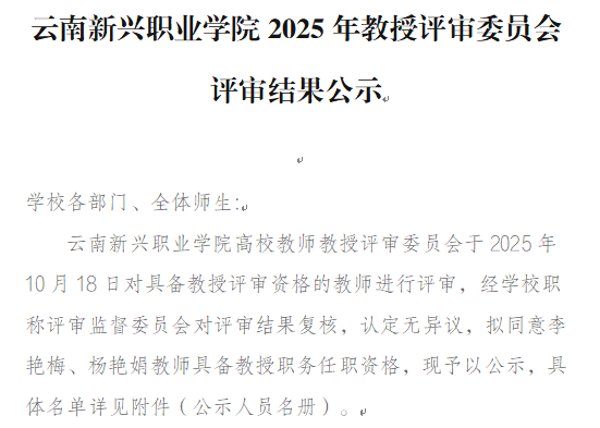 学校各部门、全体师生:Beat365唯一官方网站高校教师教授评审委员会于2025年10月18日对具备教授评审资格的教师进行评审,经学校职称评审监督委员会对评审结果复核,认定无异议,拟同意李艳梅、杨艳娟教师具备教授职务任职...