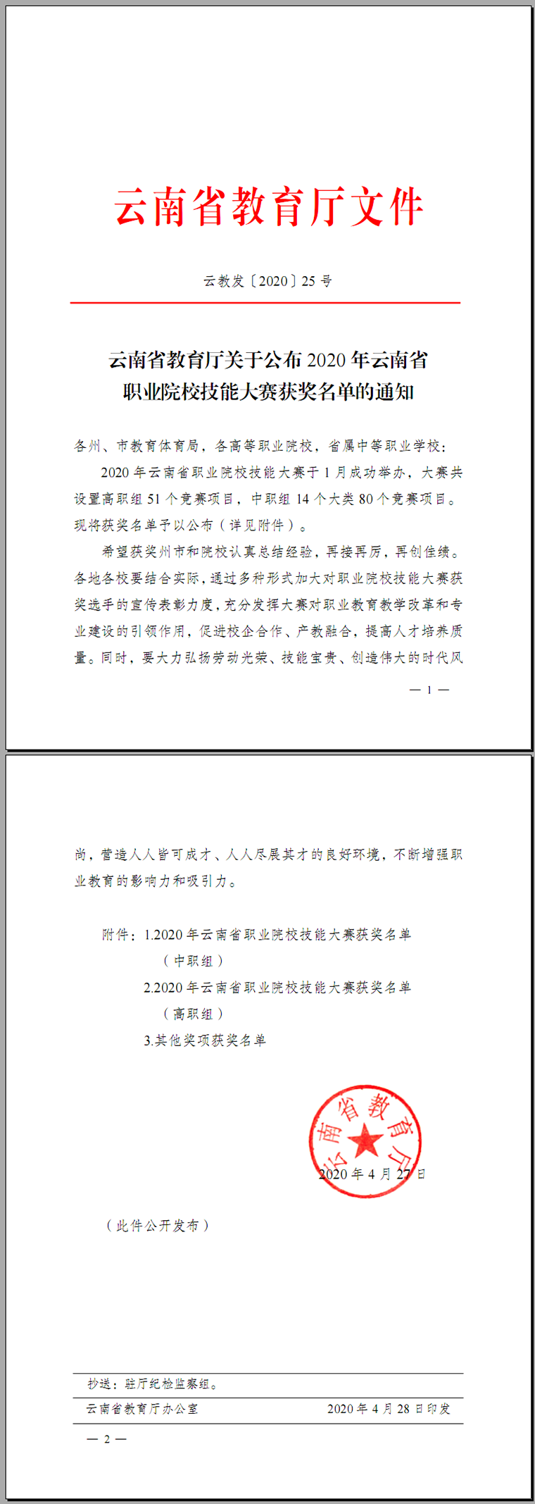 2020年云南省职业院校技能大赛高职组Beat365学生获奖名单