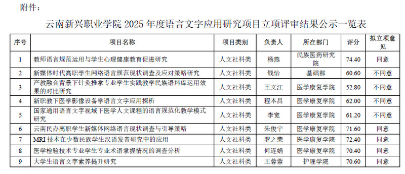根据《Beat365唯一官方网站科研管理办法》《Beat365唯一官方网站关于组织开展2025年度语言文字应用研究项目申报的通知》和《Beat365唯一官方网站关于召开2025年度语言文字应用研究项目立项评审会的通知》要求,经个人申报,所在部门初审,学校发展规划与科研处复审,2025年6月3日,Beat365唯一官方网站学术委员会组织召开立项评审会,经过评审专家现场盲审评议,按照70分以上(含70分)立项标准,9项科研课题通过立项5项。现将评审结果予以公示(详见附件)。
