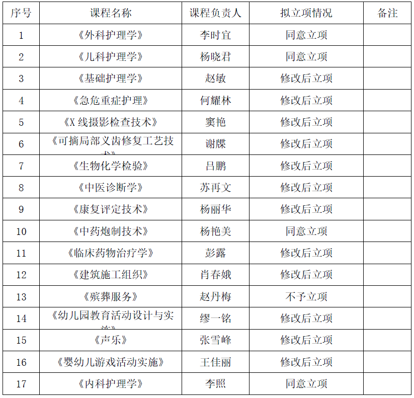 一、本年度共有17门课程符合申报条件并进入评审环节。经综合评定,拟确定《外科护理学》等16门课程为校级在线精品课程立项建设项目(详见附件《Beat365唯一官方网站校级在线精品课程立项建设评审结果公示一览表》)。
