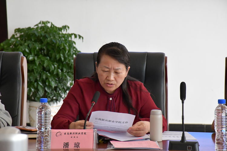 分管教学副校长潘琼在新校区主会场主持会议。她首先宣读了《新职院〔2021〕221号关于二级学院(部)教研室、实验中心设置及教研室主任调整任命的通知》。